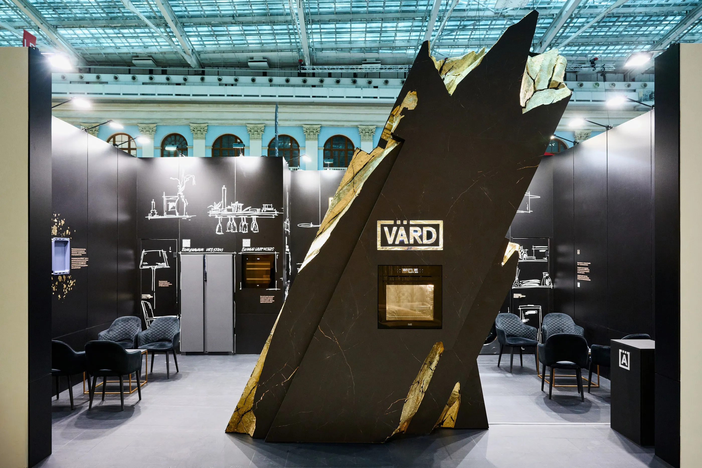 Symbolizing northern purity, a 4.5-meter marble rock stands surrounded by illustrated walls, drawing in interior designers with discounts and bonuses for incorporating Vard’s appliances into their projects.